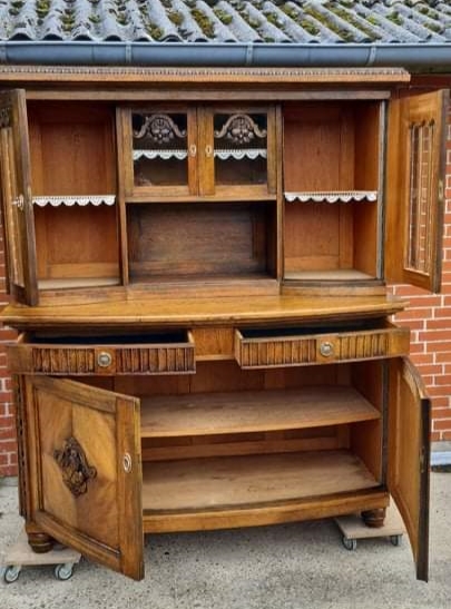 Regał po renowacji to przepiękny mebel. Drewno zostało starannie wyszlifowane i wypolerowane, odzyskując swój naturalny piękno i nadając mu ciepły, przyjazny blask. Spoiny zostały wzmocnione, a wszystkie okucia zostały wymienione, zapewniając, że regał jest trwały i solidny. Fronty zostały odnowione i pomalowane na piękny kolor, który podkreśla jej styl i elegancję. Wewnątrz zostały wyczyszczone i odświeżone. Regał jest teraz gotowy do użytku przez wiele lat i przechowywania różnych przedmiotów.