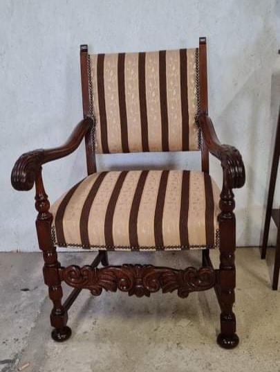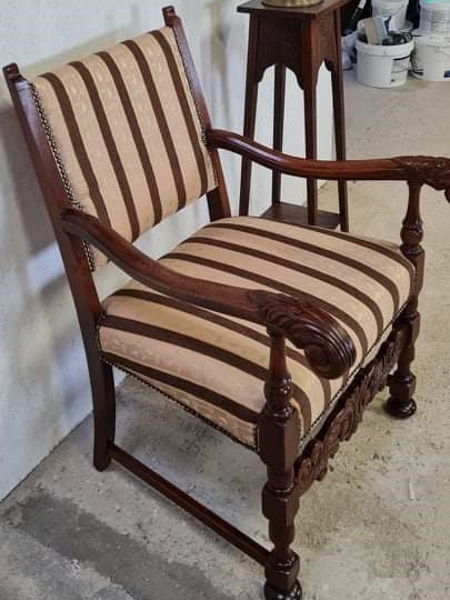 Fotel po renowacji to prawdziwe dzieło sztuki. Ramie drewniane zostało starannie wyszlifowane i wypolerowane, odzyskując swój naturalny piękno i nadając mu ciepły, przyjazny blask. Spoiny zostały wzmocnione, a wszystkie okucia zostały wymienione, zapewniając, że fotel jest trwały i solidny. Tapicerka została profesjonalnie wyczyszczona lub wymieniona, a ogólny wygląd odświeżony. Fotel jest teraz bardziej wygodny i zachęca do relaksu. Gotowy do użytku przez wiele lat.